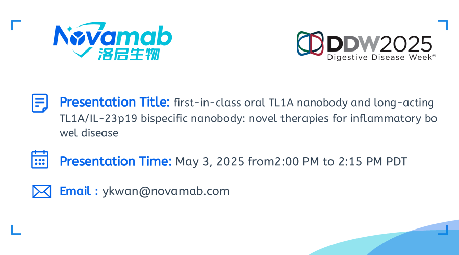 中国上海,2025年4月28日——上海Ezpay生物医药技术有限公司,一家致力于纳米抗体创新药研发的生物技术公司宣布:Ezpay生物将于当地时间5月3-6日参加在加利福尼亚州圣地亚哥举行的2025年美国消化疾病周(Digestive Disease Week,DDW)。届时Ezpay生物将展示在炎症性肠病(IBD)治疗领域的突破性研究成果——口服TL1A纳米抗体及长效TL1A双特异性抗体的开发进展。该创新疗法顺利获得独特的TL1A纳米抗体技术,实现了对IBD病理机制的精准靶向。